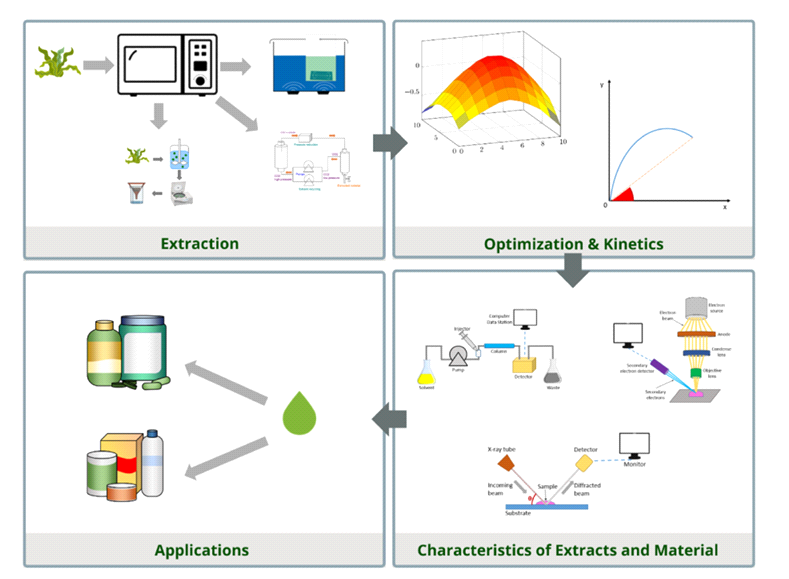 Algae are used to make carrageenan, agar, and algin. Algin comes from brown algae such Ascophyllum, Cystoseira, Lallinaria, Macrocystis, Sargassum, and Turbinaria; carrageenan comes from Eucheuma, Gigartina, and Hypnea; and agar comes from red algae like Gracilaria, Gelidiella, Gelidium, and Pterocladia. Research and healthcare institutes employ agar as a substrate for eukaryotic cell tissue culture and bacteriologic culture. Alginates derived from brown algae cell walls are utilized as emulsion and suspension stabilizers in the food and pharmaceutical industries. Xanthophyll finds extensive use in coloring medications and cosmetics. Water-soluble pigments called phytobillins, particularly blue phycobilin from Arthrospira, are utilized as colorants in food and cosmetic items. [51]. Various sectors, including dairy, food, confections, pharmaceuticals, textiles, paint, paper, and varnish, use these seaweeds as thickening, gelling, and stabilizing agents. Other compounds that are derived from marine algae include iodine, mannitol, laminarin, and fucoldin. In addition to being employed in food, carrageenans are also utilized in textiles, cosmetics, and medications[52].