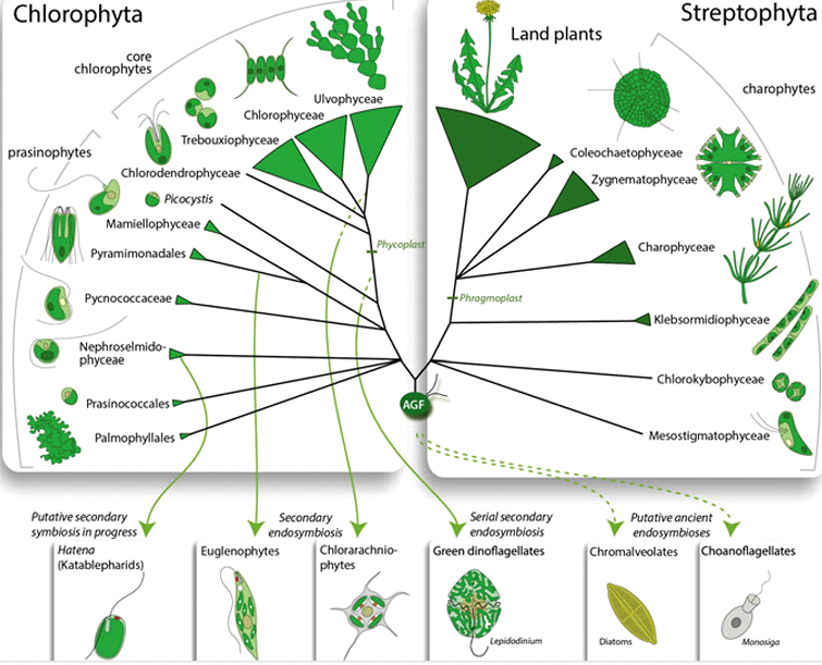 Fig no. 1 Chlorophyta and Streptophyta, the Chlorophyta comprises most of the described species of green algae. The Streptophyta includes charophytes, a few freshwater algae, and the land plants (Picture courtesy: Dr. Frederik leliaert) Figure from Leliaert et al. (2012) [9].