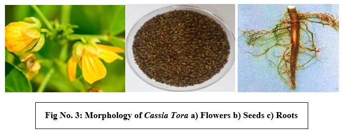 The annual fetid herb Cassia tora grows between 30 and 90 cm tall. Leaves are green; pinnate, up to 6-8 cm long, leaflets are in 3 pairs, distinctly petioled, opposite, conical at one end, ovate, oblong, and base oblique [7]. Rachis has a conical gland between the two lowest pairs of leaflets and is grooved with more or less pubescence. The stipules are linear-subulate and measure 1.3-2 cm in length. Three pairs of opposite-facing leaflets, measuring 2.5–4.5 cm in length and 1.3–2.5 cm in width, are oblong-elliptic in shape, membrane-bound, glabrous, or somewhat pubescent. The leaflet's smallest pair is the lowest pair. Petiolules are 2.5 mm long and pubescent. In the leaf axils, flowers are typically found in subsessile pairs. Glabrous calyxes are separated into ovate spreading segments 5 mm long at the base. There are five pale yellow petals, each measuring 8 mm in length and 2.5 mm in width. There are ten stamens; three upper ones have been reduced to minute staminodes, while the other seven are flawless and of subequal size. Pods are obliquely septate, 12.5–20 cm long, and 4-5 mm wide. When they are young, they are significantly curved. There are 25–30 seeds, each rhombohedral in shape, green in color, and oriented with its long axis toward the pod [11].
