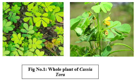 Cassia tora Linn (Family: Leguminosae) is an annual shrub that grows all over tropical countries (throughout India, Pakistan, Bangladesh, and western China) and grows well in wasteland as a rainy season weed [7,8]. Although the plant is present throughout the rainy season, it bears flowers and fruit from August to November [9]. In India, there are 45 known species of Cassia. It spreads widely across waste areas, riverbanks, roadside ditches, low-lying hills, agricultural fields up to 1000–1800 meters, plains, and low-lying coastal regions. It thrives in moist, arid regions of India's uncultivated tropical fields, especially in the country's center and south [10].