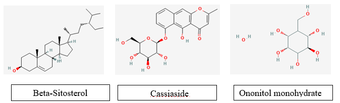 Leaves: Preliminary phytochemical tests of the leaves showed the presence of polyphenols, which drove researchers to estimate their antioxidant and antiproliferative potential [2]. It showed mainly the presence of anthraquinone glycosides and flavonoids such as Rhein, emodin, physcion, chrysophanol (marker), obtusin, chryso-obtusin-2-Oβ-D-glucoside, obtusifolin, and chrysoobtusin-2-O-β-D-glucoside. Emodin, triacontan-1-ol; Stigmasterol; Sennosides and Aloe emodin; 1,6,8-trihydroxy-3-methyl anthraquinone [7]. Ononitol monohydrate, structurally similar to a glycoside, was isolated from Cassia tora leaves [13].