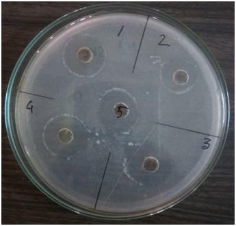 Assessment of antibacterial activity of crude sample against Gram negative bacteria (E. coli) was measured by the agar well diffusion method. 5 mm wells were cut in each fresh inoculated bacterial plates and 10 µl of different concentration of the test sample was loaded into the 5 mm diameter well seeded with test bacteria and incubated for 24 h. at 37 °C. The potency was measured by zone diameter of growth inhibition of crude extracts.