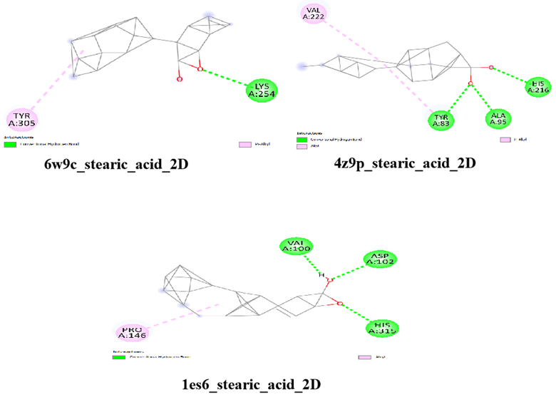 From the above analysis it is clear that stearic acid possesses highest band gap and highest LUMO energy levels which is responsible for showing highest activity against two different targets in the docking analysis as shown Table 6.