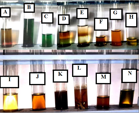 After drying the plates, they were exposed to Iodine vapours by placing in a chamber that was saturated with iodine vapours and also exposed to different spraying reagents. All plates were visualized directly after drying and with the help of UV at 254 nm and 366 nm in UV TLC viewer. The Rf value of the different pots that were observed was calculated.