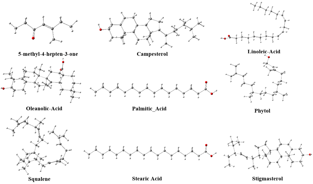Figure 8: Ground state geometries of the phytochemicals derived from methanolic extract at B3LYP/6-31+g(d) level of theory