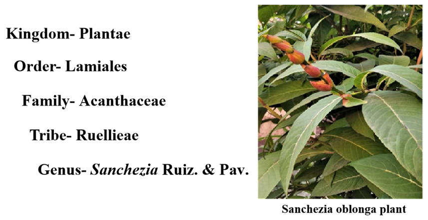 Sanchezia is a genus of the family Acanthaceae and tribe is Ruellieae was first briefly described by Ruiz and Pavon in 1974 and named by Jose Sanchez. The Plant is cultivated in India and mostly found in Western Ghat & Eastern Ghat Roots and Leaves are the most important parts of the plant as shown in Table 1. The taxonomic classification of plants at the family stage is crucial in figuring out which plant species are valuable to the local population. According to Phillips and Gentry [18], certain plant families are unquestionably more helpful than others in particular use categories. According to Scotland and Vollesen [19], the family Acanthaceae has roughly 221 genera and 4000 species that are found widely throughout the Old and New World Tropics. An exceptional variety of taxa, morphological and ecological features, and geographical distribution distinguish the Acanthaceae as a global group of flowering plants. More than 93% of the Acanthaceae species on Madagascar are considered endemic, making it the island with the highest degree of endemism [20]. Furthermore, Acanthaceae boast a remarkably rich fossil record as well as marked taxonomic diversity [21]. Most species of Acanthaceae live in small populations, especially in tropical ecosystems that exhibit high alpha diversity. Tropical botanists have struggled with this for a long time as we attempt to understand the evolution of species in these regions. The genus Sanchezia is included in the subfamily Ruellieae. This genus is native to the New World and comprises 59 species which are diverse morphologically, ecologically, and geographically [22]. Sanchezia species are widely commercialized as ornamentals are often planted as street shrubs or living fences (Scotland and Vollesen, 2000).Sanchezia oblonga Ruiz & Pav. (Acanthaceae) belong to the family of neotropical herbs and shrubs. Sanchezia oblonga is a small, semi-woody erect evergreen shrub growing 1.3 to 2.4 meters. Stems are bright green to purple. Leaves are large, up to 26 centimeters in length, opposite, lanceolate. Green blade with clearly visible veins of white or yellow. Flowers are yellow, tubular, with red bracts, about 5 centimeters long, and borne in terminal spikes of 6 to 10 as shown in Figure 1. Fruits are oblong capsules with 6 to 8 circular, compressed seeds. Several species of Sanchezia, such as S. parvibracteata, S. nobilis and S. speciosa, are cultivated as ornamentals in tropical areas and botanical gardens due to their colorful leaves and conspicuous bright and colorful bracts and flowers. Recently, this genus was revised by Leonard and Smith (1964); among 58 species, over half were newly described [23].Sanchezia is named for José Sánchez, a nineteenth-century professor of botany at Cádiz, Spain (Clay et al., 1987).They reported Species of ot this genus are S. lampra, S. ovata Ruiz & Pav., S. parvibracteata , S. parviflora, S. peruviana, S. putumayensis , S. sericea, S. speciosa, S. nobilis Hook.f. (Wiersema and León, 2013) [24], S. oblonga (wikispecies: Sanchezia oblonga).