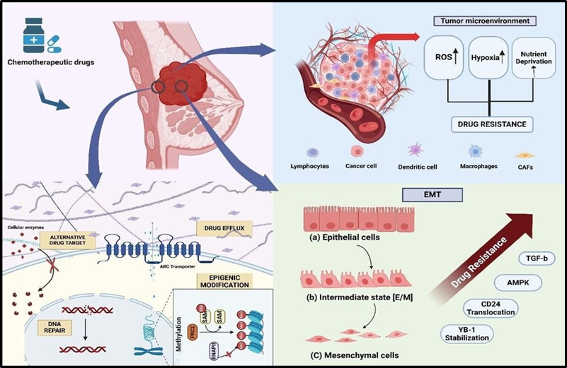 A significant number of cancer patients show resistance to treatment.In triple-negative breast cancer, resistance to first-line therapy is particularly high, impeding further treatment efforts. Common breast cancer drugs work through various mechanisms: hormonal treatments like tamoxifen, estradiol, and letrozole modulate hormone activity involved in cell proliferation; monoclonal antibodies such as trastuzumab target HER2-positive cancer; and chemotherapeutic agents like taxanes (e.g., paclitaxel and docetaxel) and anthracyclines (e.g., doxorubicin and daunorubicin) address different aspects of cancer growth. Breast cancer cells can become resistant to chemotherapeutic drugs with different mechanisms.