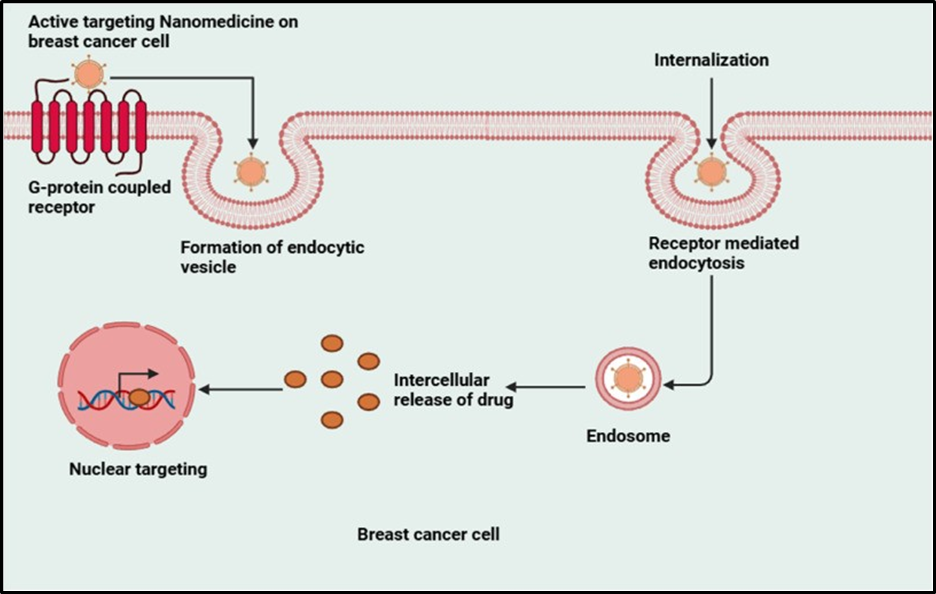 Passive drug targeting is widely used for nanomedicine-based delivery system. It uses unmodified NPs, which exploit their surface properties, such as size, shape, charge, and stiffness. Owing to their leaking blood arteries and inadequate lymphatic drainage, tumors are more likely to accumulate minute particles .The enhanced permeability and retention (EPR) can improve the precision of medication delivery to BC Anticancer drugs such as doxorubicin, paclitaxel, and RNA can penetrate tumor cells and increase the potency of non-receptor-dependent medications via passive targeting, such as macro-pinocytosis. Although, this is not the most effective or selective approach, it is frequently used in cancer therapy.