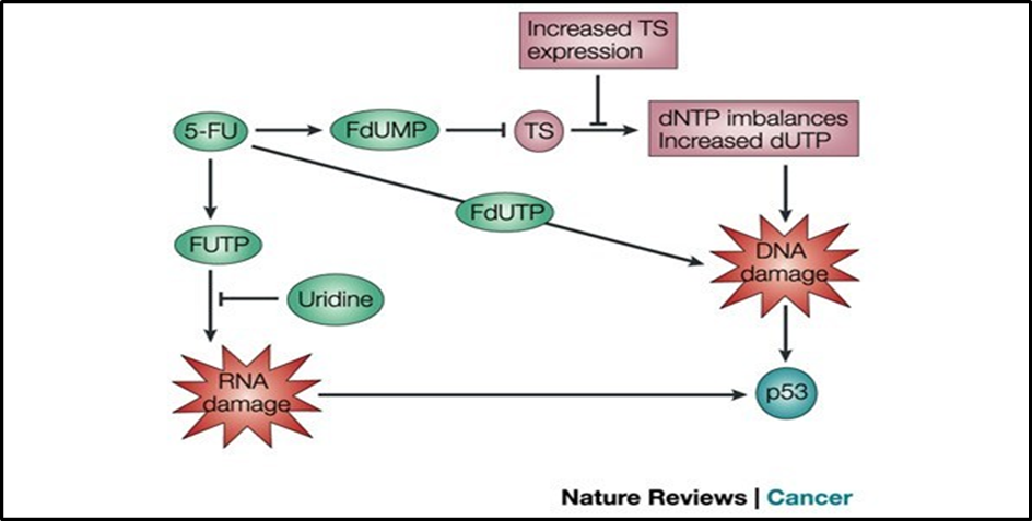 In mammalian cells, 5-FU is converted to fluorodeoxyuridine monophosphate (FdUMP), which forms a stable complex with thymidylate synthase (TS), and thus inhibits deoxythymidine mono-phosphate (dTMP) production.
