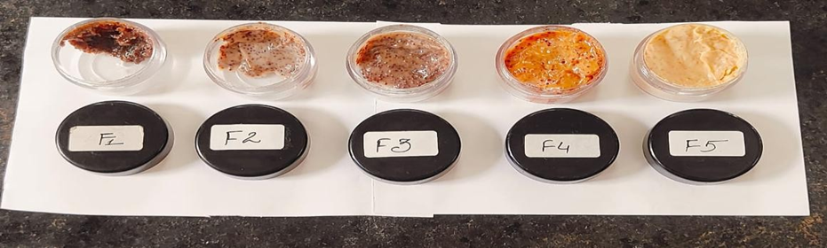 The cream scrub formulations (F1–F5) were evaluated for various physicochemical parameters to identify the most suitable batch. All formulations exhibited a brown color, floral odor, and semi-solid consistency, indicating uniformity in base composition. Among them, formulation F5 demonstrated optimal characteristics in terms of safety, stability, aesthetics, and performance, and was therefore selected as the optimized formulation.