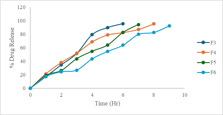 The dug release study was performed using USP Type II dissolution test apparatus in 0.1N HCI buffer of with pH 1.2. The temperature and speed of the apparatus were maintained at 37oC and 50 rpm respectively. The samples were withdrawn at predetemined time interval and analyzed for drug concentration at 285 nm by UV-Visible