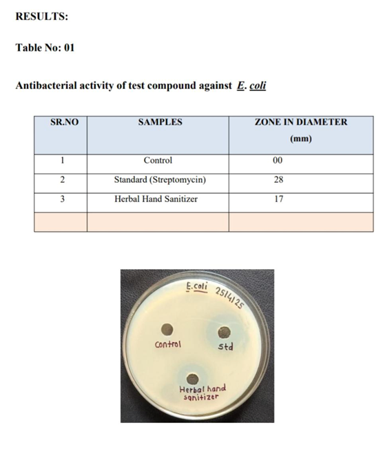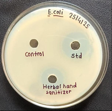 The herbal hand sanitizer’s capacity to eradicate or suppress dangerous pathogens like bacteria is assessed by the antimicrobial test. The widely used Agar Well Diffusion Method involves inoculating an agar plate with bacteria (such as S. or E. coli) and then placing a tiny quantity of the sanitizer in a well on the plate. The zone of inhibition surrounding the well, where bacterial growth is inhibited, is measured to assess the test after the plate has been incubated at 37°C for 24 to 48 hours. Stronger antimicrobial activity, which implies that the sanitizer is working against the bacteria, is indicated by a bigger clear zone. A zone that is narrower or nonexistent indicates a weaker or nonexistent antibacterial effect. This test makes sure the sanitizer offers consistent defense against dangerous bacteria.