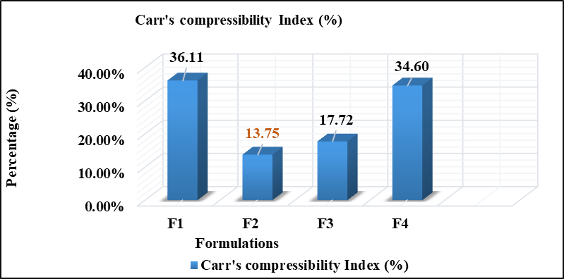 Among all formulations, F2 and F3 exhibited superior flow properties, making them more suitable for direct compression, while F1 and F4 demonstrated poor flowability, which could affect tablet uniformity and manufacturability.