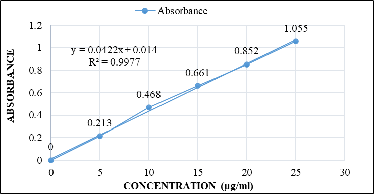 Preparation of Stock Solution: A standard curve was generated by dissolving 100 mg of Ibuprofen in phosphate buffer (pH 7.2) and adjusting the volume to 100 mL. This stock solution was then further diluted to obtain a concentration range of 0–25 µg/mL. The absorbance values were recorded at 221 nm.