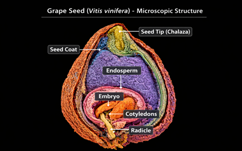 Microscopy of grape seeds (Vitis vinifera) reveals a pear-shaped, trigonal structure comprising an outer cuticle, an epidermis, and two inner integuments surrounding the embryo and endosperm. Anatomical studies show that seed color changes from green to dark brown during ripening, accompanied by phenolic oxidation and increased hardening. Advanced techniques like NMR and scanning electron microscopy (SEM) are used to analyze these structures.