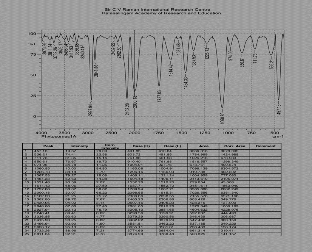 FTIR spectroscopy was performed to study the functional groups present in the phytosome formulation and to confirm the interaction between the phytoconstituent and phospholipid.The FTIR spectrum of the phytosome formulation showed characteristic absorption peaks at different wave numbers. A broad peak observed in the region of 3400–3300 cm?¹ corresponds to O–H stretching vibrations, indicating the presence of hydroxyl groups, which are commonly found in plant polyphenols and flavonoids.The absorption band around 2920–2850 cm?¹ is attributed to C–H stretching vibrations of aliphatic chains, confirming the presence of phospholipid components.A prominent peak observed near 1730–1700 cm?¹ represents C=O stretching vibrations, which may be due to ester or carbonyl functional groups of phospholipids.The peak in the region of 1650–1600 cm?¹ corresponds to C=C stretching or amide bond vibrations, indicating possible interaction between the phytoconstituent and phospholipid.Absorption bands in the region of 1250–1050 cm?¹ are assigned to P=O and P–O–C stretching vibrations, which are characteristic of phosphatidylcholine, confirming the formation of phytosome complex.The presence of all major functional group peaks with slight shifts in wave numbers suggests successful complexation of the phytoconstituent with phospholipids without any chemical degradation. Hence, the FTIR study confirms the formation and stability of the phytosome formulation.