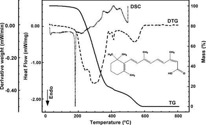 The melting point will be determined using the open capillary method with Thiele’s tube. A small amount of tretinoin will be placed into a thin-walled capillary tube, 10-15 mm in length and approximately 1 mm in internal diameter, with one end sealed. Liquid paraffin oil will be added to the Thiele's tube, which is then placed over a flame. The capillary tube containing the sample will be suspended in the Thiele’s tube, and the sample will be heated slowly. A thermometer will be used to monitor the temperature, and the temperature at which the sample begins to melt will be recorded as the melting point. (16).