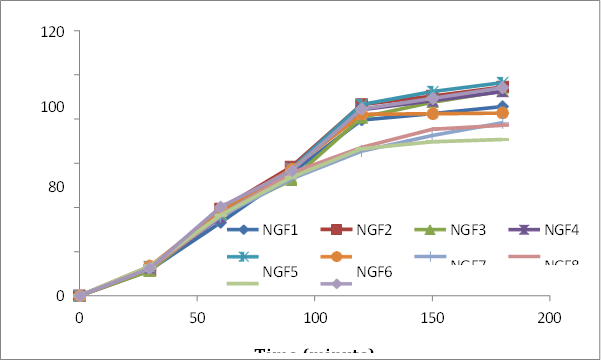The drug content of the gel formulations was consistent across the various batches, ranging from 89.93% to 96.70%. Notably, the formulation batches NGF4, NGF5, NGF6, and NGF7 demonstrated drug content above 95%. The content uniformity of the gel formulations is presented in Table 3.8. Among these, formulation NGF5 exhibited a drug content of 99.2%.