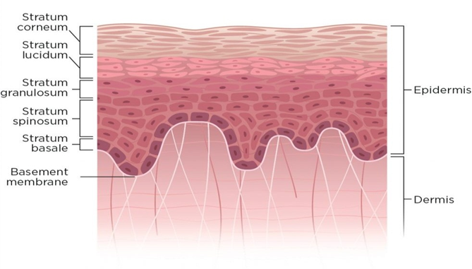 This layer is finished up of several layers of living cells coupled by desmosomes, which are protein-based structures that aid in holding the cells together. Epidermis' deepest layer and are in charge of creating new skin cells, are located in the stratum basale. Melanocytes, which are found in this layer as well, are responsible for producing the colour. The heterogeneous epidermis' uppermost layer, the stratum corneum, has a thickness that ranges from 10 to 30 micrometres. It consists of 15–25 cornified, layered, flattened, hexagonal cells that are enclosed in an intercellular lipid mortar. The thickness of the stratum corneum varies, nevertheless.