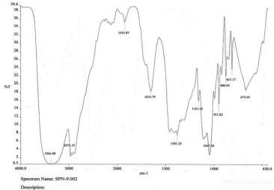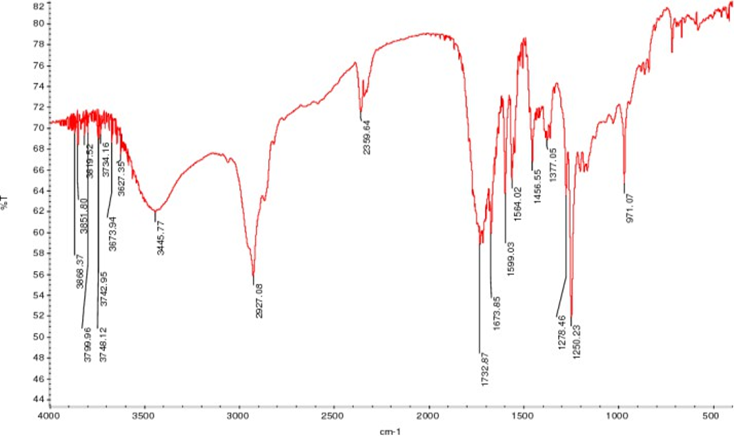 The FT-IR spectrum of tretinoin was recorded in the range of 4000 to 400 cm?¹ using the KBr pellet method with an FT-IR spectrophotometer. To prepare the KBr disc, 1 mg of tretinoin was mixed with 100 mg of spectroscopic-grade KBr, which was dried using an IR lamp. The mixture of KBr and the drug was then subjected to hydraulic pressure to form a disc. This disc was placed in the FT-IR chamber, and the infrared spectrum was recorded within the range of 4000 to 400 cm?¹. (16).