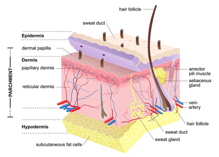 The skin is continuous, with the mucous membranes lining the body's surface. The skin is made up of three distinct structural layers, viz., epidermis, dermis and hypodermis. The derivatives of skin include nails, hair, sebaceous gland, and sweat glands.