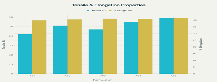 The tensile strength of the patches was evaluated using a Universal Strength Testing Machine with a sensitivity of 1 gram. The instrument was equipped with two load cell grips, in which the lower grip remained fixed while the upper grip was movable. A test film of dimensions 4 × 1 cm² was placed between the grips, and a gradually increasing force was applied until the film ruptured. The tensile strength of the film was then determined from the kilogram dial reading. Tensile strength is expressed as follows.