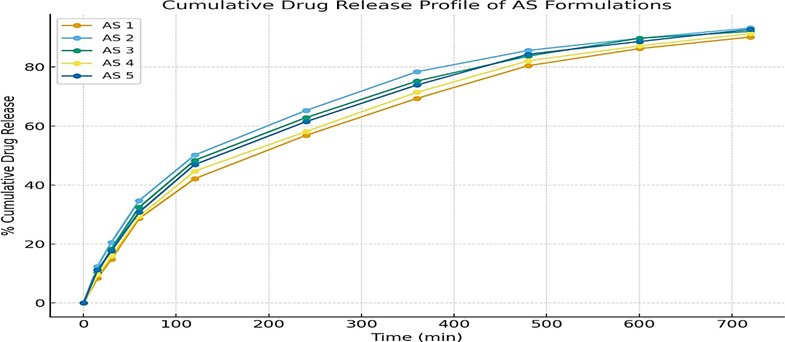 The cumulative percentage of drug released over 12 h ranged from 90.18 ± 0.532 % (AS1) to 93.25 ± 0.474 % (AS2) for the Astragaloside IV transdermal films.