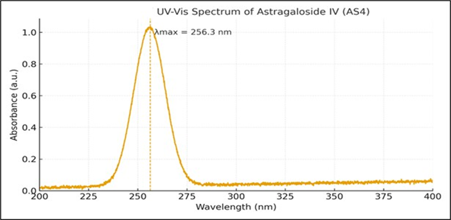 A calibration curve of Astragaloside IV was constructed using the UV–visible spectrophotometric method. Precisely 50 mg of Astragaloside IV was weighed and transferred into a 50.0 mL volumetric flask, dissolved in HPLC-grade methanol, and diluted to volume to obtain a stock solution of 1000 µg·mL?¹. The stock solution was stored at 2–8 °C and protected from light. The UV spectrum of the stock solution was scanned between 200 and 800 nm using a Shimadzu UV-2450 spectrophotometer, The Maximum absorption wavelength (λ max) was identified. From the stock, working standard solutions of 5, 10, 15, 20 and 25 µg·mL?¹ were prepared from the stock by appropriate dilution in methanol; all solutions were filtered through 0.22 µm syringe filters prior to measurement. The absorbance of each standard (measured in triplicate) was recorded at 256 nm versus a methanol blank. A calibration curve was constructed by plotting concentration (µg·mL?¹) on the X-axis against mean absorbance on the Y-axis.