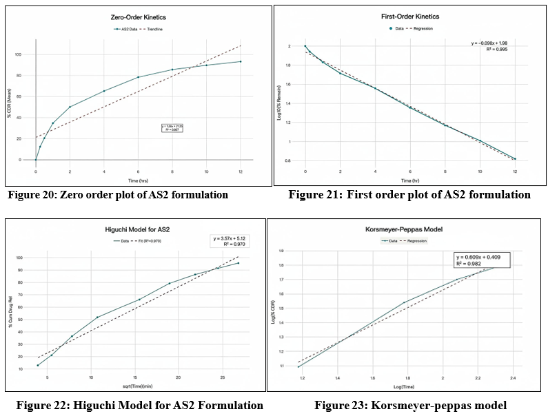 The in vitro drug release kinetics of the formulated transdermal patches were analyzed by fitting the release data to different mathematical models, namely zero-order, first-order, Higuchi, and Korsmeyer–Peppas equations, to determine the predominant release mechanism of Astragaloside IV. The zero-order model describes a constant rate of drug release independent of concentration, expressed as Q=Q0+K0t