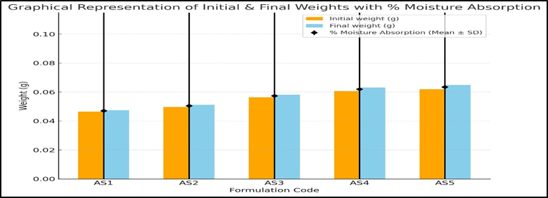 The patches were accurately weighed and placed in a desiccator containing saturated potassium chloride solution, maintained at room temperature to provide 80–90% relative humidity. They were stored until a constant weight was obtained, after which the patches were removed and reweighed. The percentage of moisture uptake was calculated from the difference between the initial and final weights, relative to the initial weight.