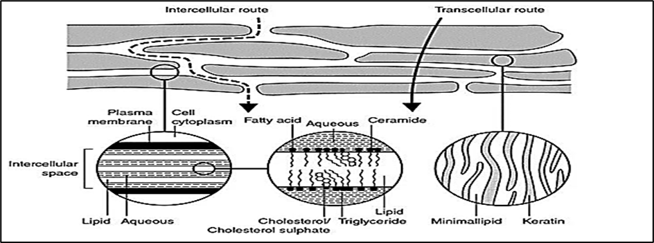 Drug molecules can traverse the skin by three main pathways: (i) the transcellular route through corneocytes, favouring hydrophilic molecules; (ii) the intercellular lipid route, favouring lipophilic compounds; and (iii) appendageal pathways through hair follicles and sweat glands, which represent only ~0.1% of the surface but can provide entry sites for ions, macromolecules, or particulate carriers. However, the SC barrier remains the dominant determinant of absorption, and most drug candidates fail to reach therapeutic systemic levels without additional formulation strategies.4