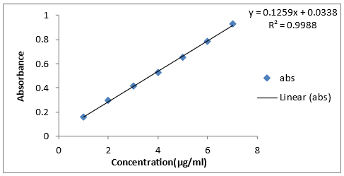 A standard stock solution of Tretinoin (100 µg/ml) was prepared using methanol. Initially, 10mg of the drug was dissolved in 100ml of methanol to create a 100ppm stock solution. Subsequently, methanol was utilized to dilute this solution, resulting in dilutions ranging from 1 to 7µg/ml in a UV-visible spectrophotometer. The absorbance of these diluted solutions was then measured at 351nm, with methanol acting as the blank. A standard curve was plotted against concentration, and from this curve, the intercept, slope, straight line equation, and correlation coefficient were determined.