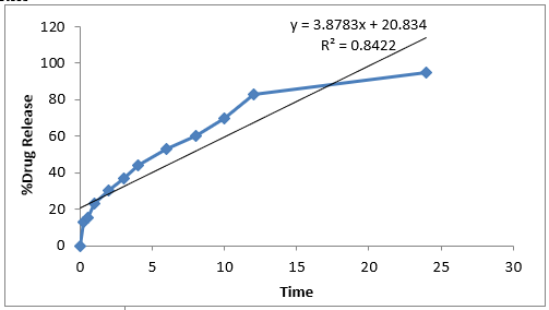 In the present study, raw data obtained from in vitro release studies was analyzed, where in data was fitted to different equations and kinetics model to calculate the percent drug release and release kinetics of optimized formulation. The kinetic models used were a Zero-order equation, First-order, Higuchi’s model and Korsmeyer-Peppas equation [23-25].