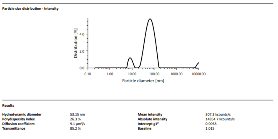 From the figure 6 it was concluded that particle size 53.15 nm. Thus, the results show that the particle size of the formed nanoemulsion was in required range therefore a transparent nano-emulsion was analysed to determine whether it is in the nano-emulsion i.e. less than 100nm.