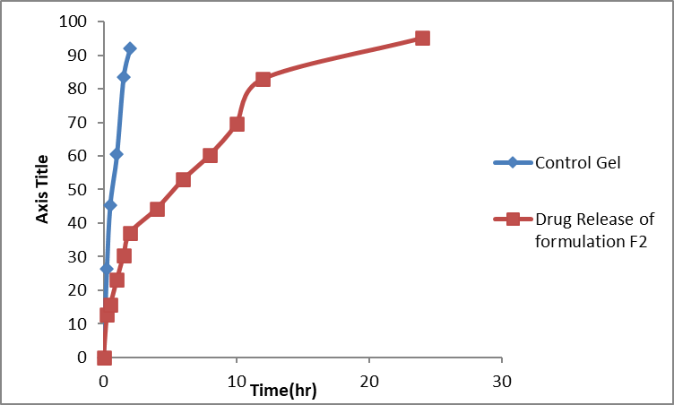 The in-vitro drug release of Tretinoin loaded nano-emulgel & control gel formulation was given in a Table 13.and figure 10. The release from control gel shows 92.09±0.80 within 2hrs. On the other hand, the release of drug in gel formulations F2G2 showed 95.17±0.66% in 24hrs in the phosphate buffer salinewith in 24hr. Drug loaded gel formulation F2 (containing 1.5% Carbopol 934) demonstrated maximum drug release up to 81.200±0.267%, within 24hr check absorbance in UV spectrophotometer range at (λmax= 351 nm).
