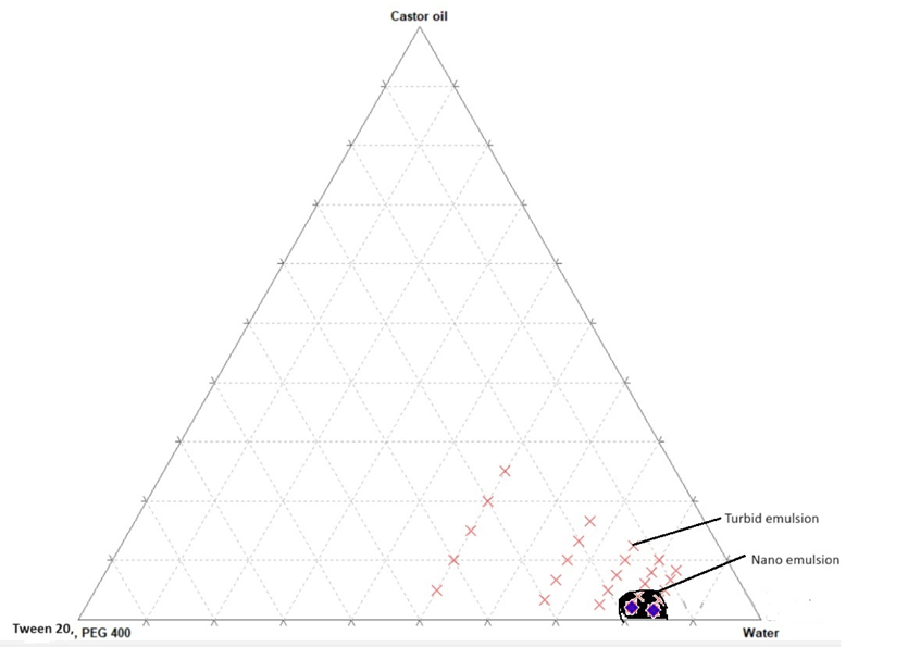 The process of phase diagrams entails the representation of three components: surfactant, co-surfactant (Smix), oil, and water, with each component representing a vertex of a triangle. Ternary mixtures with different compositions of these components were created. In every ternary mixture formed, the combined concentrations of surfactants, co-surfactants, and oil always amounted to 100%. The precise quantities of the three components were measured. Subsequently, the mixture was heated gently to a temperature of 45–50ºC and agitated vigorously to achieve a uniform mixture. Distilled water was gradually added to the mixture until a clear solution was obtained. The mass ratios of surfactant and co-surfactant were varied as 1:1, 1:2, and 2:1. Different concentration ratios of oil and the mixture of surfactant and co-surfactant were tested at 1:9, 2:8, 3:7, 4:6, and 5:5. Ternary mixtures were created based on these ratios, and the amount of water required to form a transparent solution was then plotted on the pseudo-ternary phase diagram alongside the other components.