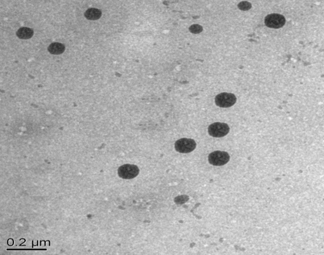 The TEM analysis of nanoemulsion was performed for morphological characterization and visualization of emulsion droplets. Nanoemulsion formulation was diluted with deionized water and mixed by gentle shaking. A drop of sample obtained after dilution was placed on copper grids, stained with 1% phosphotungstic acid solution for 30s, and finally kept under electron microscope to visualize the particle morphology [12].