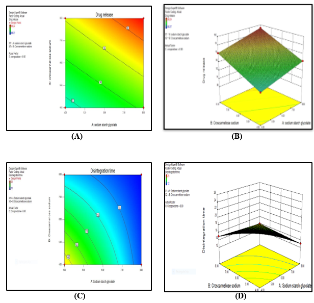 Croscarmellose sodium concentration rises from 4 mg to 8 mg, SSG rises from 4 mg to 8 mg, and Crospovidone rises from 4 mg to 8 mg, according to the Curve of Y2 (Disintegration Time). Figure illustrates the considerable decrease in disintegration time. The statistical model indicates that the eighth run is an optimal formulation. The analysis of the optimised batch's reaction, or drug release rate of 99.24% and disintegration time of 12 seconds.
