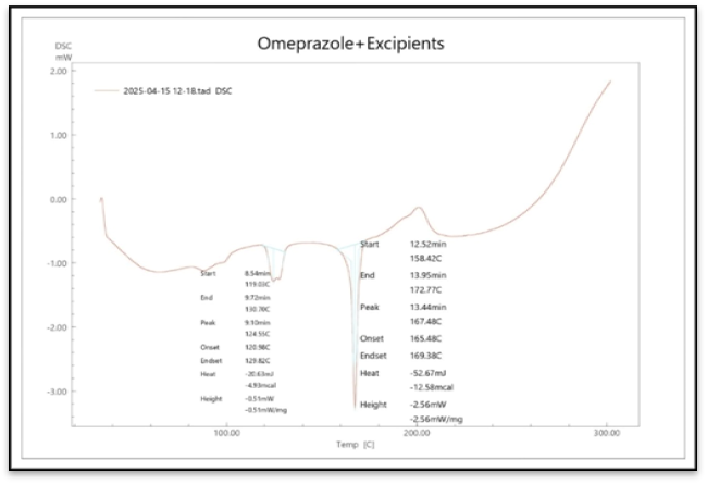 The differential scanning calorimetric technique was used to do a thermal examination of omeprazole with all excipients. An device called the Shimadzu DSC-60plus was used to evaluate the samples. All excipients and a sample equal to around 8 mg of omeprazole were heated in aluminum pans from 25 to 300 °C at a rate of 10 °C per minute.6