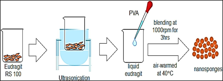 Nanosponges can be made using this process, which involves reacting polymers with cross-linkers in the absence of a solvent and sonication. The results were obtained. The nanosponges will be spherical, consistent in size, and have a high surface area. I-phenyl has a size of less than 5 microns. is used in this procedure. As a catalyst, carbonate (or Pyromellitic anhydride) is utilised. Cross - linker. In a flask, combine the polymer and cross linker. In an ultrasound machine, place the flask. Fill a bath with water and heat it to 90 degrees. As well as5 hours of sonication the solid was then crushed in. A mortar and ethanol-based Soxhlet extraction Impurities (or) unreacted polymers should be removed. After purification, the nanosponges were stored at25o c.
