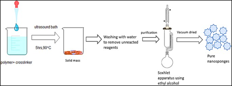 In this process, Nano sponges are made by sonicating polymers containing carbonyl cross synchronisation primitives in the absence of a solvent. These nanosponges will have a consistent spherical dimension. In a flask, combine the polymer and cross-linker in an appropriate amount. For ultrasonication, the flask is immersed in water and heated to 90°C. For continuous sonication, the mixture is held for 5 hours. The combination is then cooled, and the result is rinsed with distilled water before being purified with a Soxhlet extractor and ethanol. The final product is dried at 25 degrees Celsius, and the whitish powder is captured and processed away from dampness.