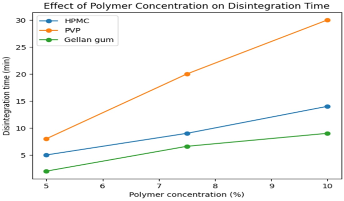 Disintegration time varied from 2 to 29.6 minutes. Gellan gum formulations showed faster disintegration due to hydrophilicity and swelling, whereas higher concentrations of HPMC and PVP delayed disintegration due to stronger matrix formation (7).