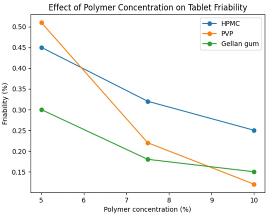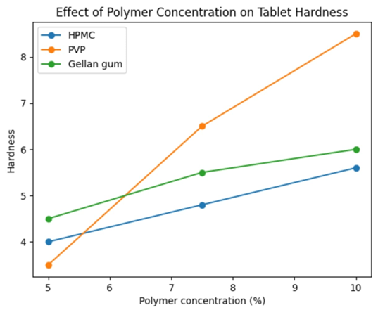 The study demonstrated that increasing polymer concentration increased tablet hardness and disintegration time while decreasing friability (Fig-1). PVP showed superior binding efficiency, resulting in stronger tablets, whereas Gellan gum facilitated faster disintegration due to its swelling nature.