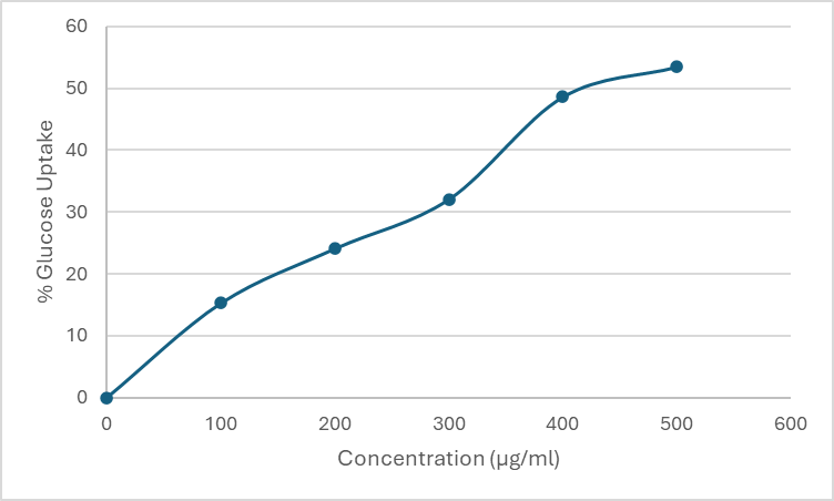 The in vitro antidiabetic activity was evaluated using Saccharomyces cerevisiae. The results showed a concentration-dependent increase in glucose uptake. The test sample exhibited 53.53% glucose uptake at 500 µg/ml, which was comparable to Metformin (57.65% at 100 µg/ml).