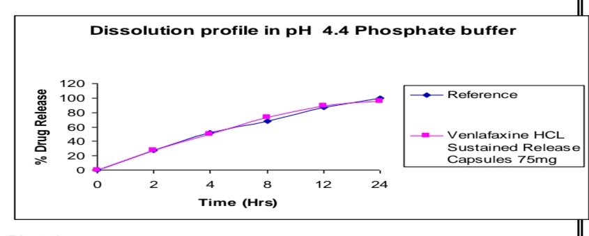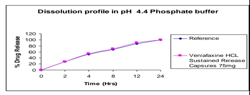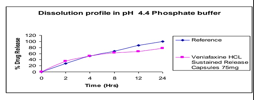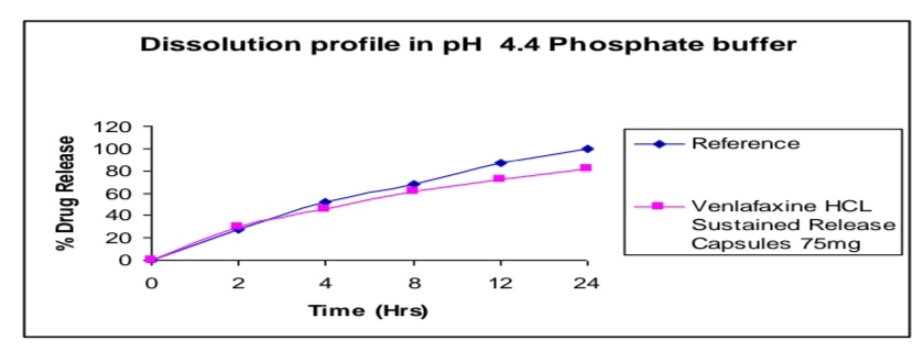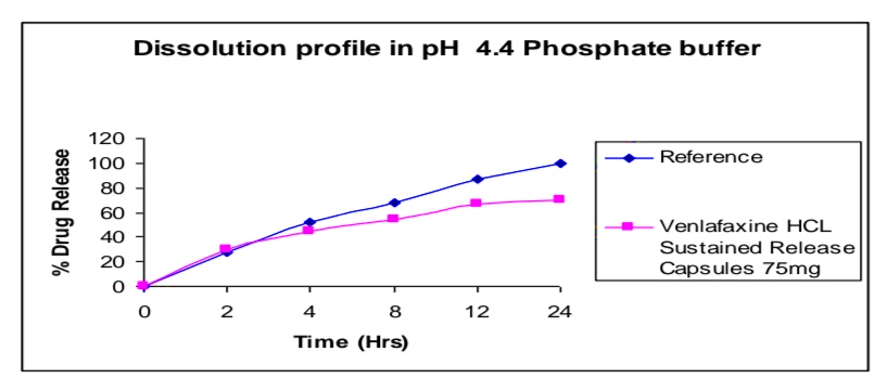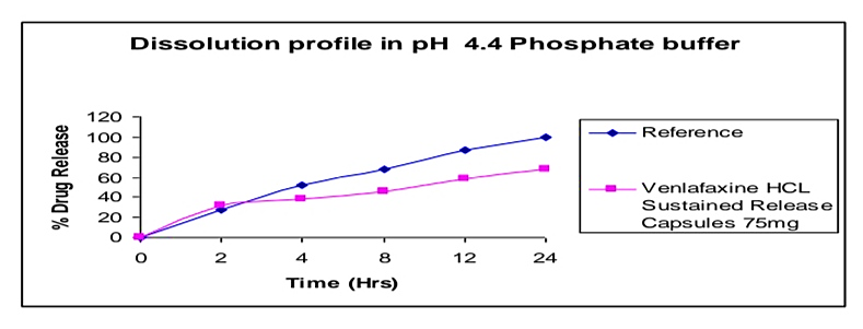The active pharmaceutical ingredient Venlafaxine HCL was subjected to preformulation study, which encompasses the “Accelerated drug excipient compatibility study” and the results obtained with selected excipients showed good compatibility with Venlafaxine HCL. The Venlafaxine HCL SR pellets were loaded in size 2 capsules. It showed good results in formulation of stable dosage. The dissolution profile of the prepared Venlafaxine HCL SR release capsules were compared with that Venlafaxine HCL SR capsules (Wyeth) of the product. The release was found more in the case of pellets loaded in the capsules. And dissolution profile of Venlafaxine HCL SR capsules was compared with that of innovator (Wyeth). The release was found similar to that of Innovator. So the prepared product was said to be equivalent with innovator. SR release pellets have minimum volume in size, greater surface area and more surface activity. The area of the drug loaded pellets release rate was also more. And also there was no need of disintegration time for pellets in capsules. Small volumes of pellets enter into the systemic circulation very fast. Moreover there was no accumulation of drug in the body. Drug release rate was more when compared with the innovator sample. In the case of Venlafaxine HCL SR capsules (Trail 8) meet the requirement for Invitro drug release were selected for stability studies. The capsules were stored in a bottle at 40°c / 75 % RH for 60 days. After 60 days samples were withdrawn and analyze. The results are reproducible and similar to theoretical set limits. Finally I conclude like Sustained Release Pellets in capsule have more drug release rate.