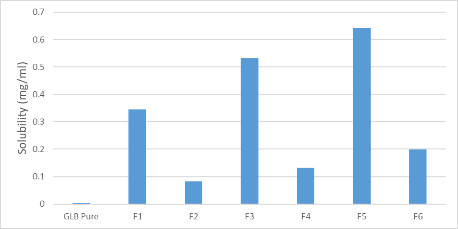 In solubility study of glibenclamide solid dispersion Saturation Solubility Studies of the formulated tablets ( F1,F2,F3,F4,F5,F6) and pure GLB. The result showed that all solid dispersion formulas increase the solubility of glibenclamide compared with pure glibenclamide. The highest increase in solubility was in Formula 5 (GLB: PVP (1:4) with a saturated solubility of0.643±0.02 mg/ml compared to the solubility of pure glibenclamide of 0.0025±0.02 mg/ml as shown clearly in table 3.7 and figure 3.3. The increase in solubility of this solid dispersion can be caused by the molecular dispersion of the drug in the hydrophilic polymer so that the wettability of the drug will increase. The presence of PEG and PVP can form the intermolecular hydrogen bonding with glibenclamide.
