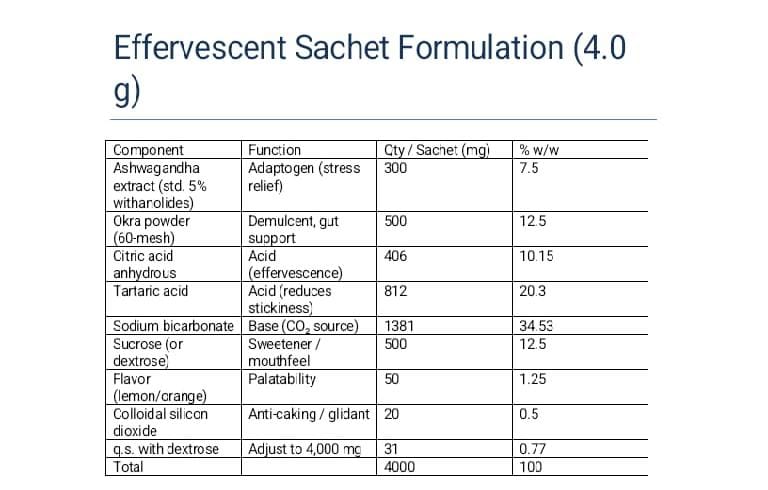 Ashwagandha and okra effervescent granules were developed in response to the increased need for safe, natural, and easy-to-use supplements.