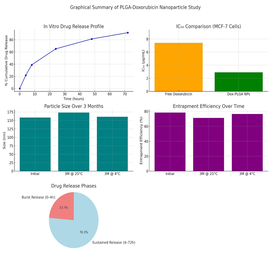 The in vitro drug release profile revealed a desirable biphasic pattern, with an initial burst followed by sustained release over 72 hours, following first-order kinetics (R² = 0.9812). The MTT cytotoxicity assay against MCF-7 breast cancer cells confirmed significantly enhanced anticancer activity of the nanoparticle formulation (IC?? = 2.9 µg/mL) compared to free doxorubicin (IC?? = 7.4 µg/mL, p < 0.01).