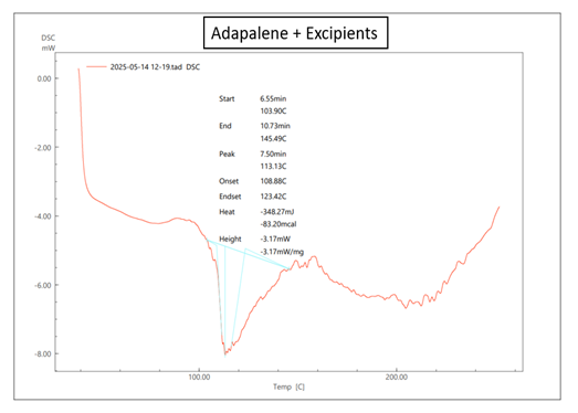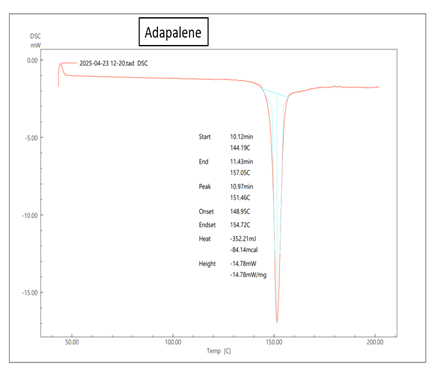 DSC was performed to study the thermal behaviour and compatibility of adapalene with the polymers and excipients used in the formulation. Thermal analysis of pure drug, polymer (Carbopol 934 and HPMC), their physical mixture and the optimized emulgel formulation was carried out using a DSC instrument. Approximately 5–10 mg of each sample was sealed in an aluminum pan and heated in the range of 30°C to 320°C at a heating rate of 10°C/min under a nitrogen atmosphere to prevent oxidative degradation. The thermograms were analysed for any shift, appearance or disappearance of melting endotherms, which could indicate physical or chemical interactions between drug and excipients [11,12].