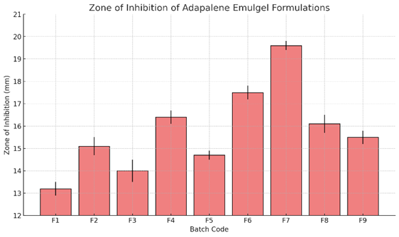 The developed Adapalene emulgel formulations were successfully optimized through a series of physicochemical, microbiological, and stability evaluations. The formulation F7 emerged as the most promising candidate, demonstrating excellent physical characteristics, stable pH, consistent drug content, efficient spreadability, and sustained drug release. The antibacterial evaluation against Cutibacterium acnes confirmed significant inhibitory activity, indicating its therapeutic relevance in acne management. Furthermore, the formulation retained its integrity and performance under accelerated stability conditions, validating its shelf-life and formulation robustness. Thus, the Adapalene emulgel F7 can be considered a safe, stable and effective formulation for the topical treatment of acne.